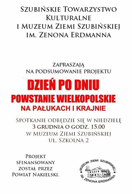 Projekt został dofinansowany przez Powiat Nakielski w ramach otwartych konkursów ofert: Podtrzymywania i upowszechniania tradycji narodowej, pielęgnowania polskości oraz rozwoju świadomości narodowej, obywatelskiej i kulturowej. Wydarzenie odbędzie się w niedzielę, 3 grudnia o godz. 15.00 w Muzeum Ziemi Szubińskiej.