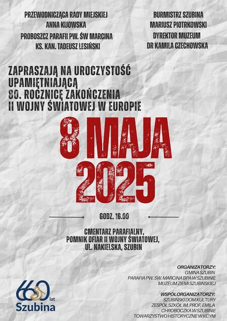 Przewodnicząca Rady Miejskiej # Anna Kijowska, Burmistrz Szubina Mariusz Piotrkowski, Proboszcz Parafii pw. św Marcina Bpa Ks. Kan. Tadeusz Lesiński, Dyrektor Muzeum Ziemi Szubińskiej im. Zenona Erdmanna dr Kamila Czechowska zapraszają na uroczystość upamiętniającą 80. rocznicę zakończenia II wojny światowej w Europie, która odbędzie się 8 maja 2025 r. o godz. 16.00 przy pomniku ofiar II wojny światowej na cmentarzu parafialnym w Szubinie.