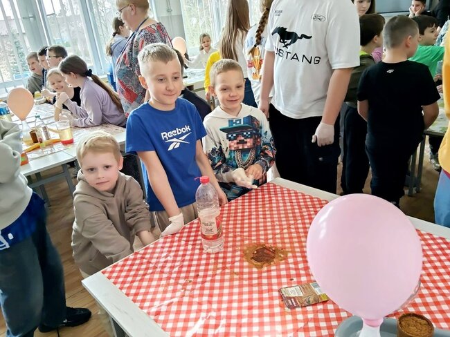 Dnia 24 marca uczniowie klasy 1 ze Szkoły Podstawowej im. Jana Pawła II w Kowalewie wraz z wychowawcą, panią Anną Kujawą, mieli wyjątkową okazję spojrzeć na chemię z zupełnie innej perspektywy – jako na dziedzinę obecną w codziennym życiu. Zajęcia zostały przygotowane we współpracy z uczniami klasy 8 oraz nauczycielem chemii, panią Dorotą Boruch. W realizację doświadczeń zaangażowani byli również nauczyciele współorganizujący proces kształcenia – p. Danuta Witosławska oraz p. Katarzyna Świtniewska, którzy wspierali uczniów na każdym etapie działań.