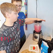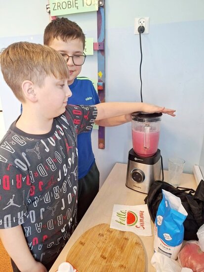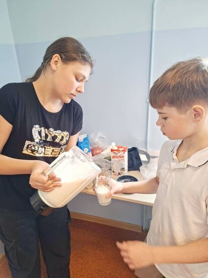 Nie zabrakło również czegoś dla miłośników owocowych smaków. Młodzież z dużym entuzjazmem przygotowywała kremowe koktajle mleczno-owocowe. Do blendera trafiły dojrzałe banany, mrożone maliny i truskawki, które w połączeniu z mlekiem stworzyły orzeźwiające, gęste napoje, pełne naturalnej słodyczy i błonnika. Warto dodać, że na stołach zagościła jeszcze ciepła chałka domowego wypieku, z dużą ilością kruszonki.