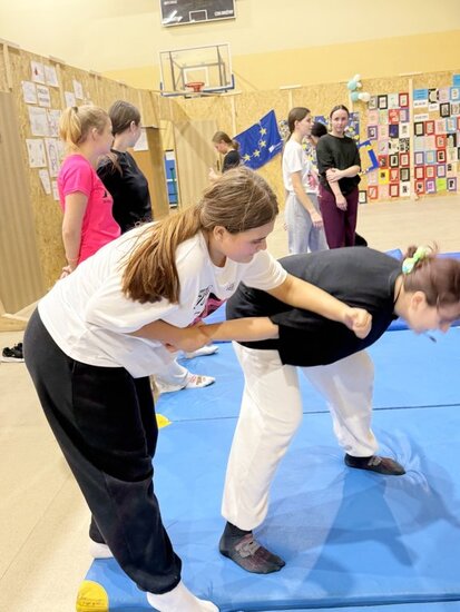 Program zajęć został przygotowany tak, aby rozwijać zarówno sprawność fizyczną, jak i umiejętności odpowiedzialnego zachowania w sytuacjach wymagających opanowania i koncentracji. Podczas części poświęconej samoobronie, pod czujnym okiem trenera Sebastiana Dobosiewicza, młodzież zapoznała się z podstawami zasad bezpieczeństwa oraz podstawowymi technikami obronnymi. Uczestnicy ćwiczyli m.in. pady, bezpieczne upadanie oraz proste dźwignie, ucząc się reakcji na potencjalne zagrożenia i sposobów na uwolnienie się z chwytów. Równocześnie trenowali podstawowe elementy musztry policyjnej, które kształtowały dyscyplinę, precyzję wykonywanych ruchów oraz współpracę w grupie. Kolejnym etapem szkolenia były zajęcia z podstaw strzelectwa.