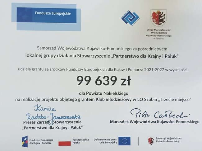 Zajęcia i wyjazdy w ramach działania Klubu młodzieżowego “Trzecie miejsce” w I Liceum Ogólnokształcącym w Szubinie są całkowicie bezpłatne, dofinansowane w ramach inicjatywy „Młodzi w Dolinie Noteci”, współfinansowanej ze środków programu regionalnego Fundusze Europejskie dla Kujaw i Pomorza 2021–2027.
