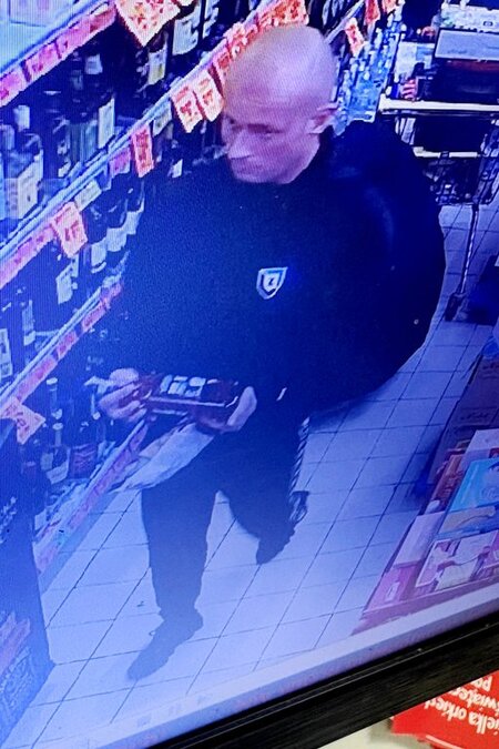 - również alkohol ukradł mężczyzna w wieku 35-45 lat, ubrany w kurtkę  koloru ciemnego, ciemne spodnie, średniego wzrostu, łysy. Jego wizerunek zarejestrował sklepowy monitoring (L. dz. 4553/25)