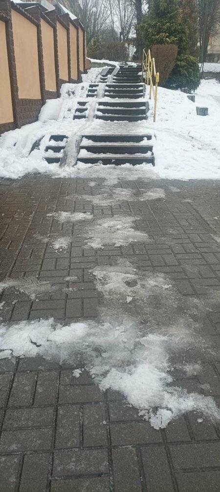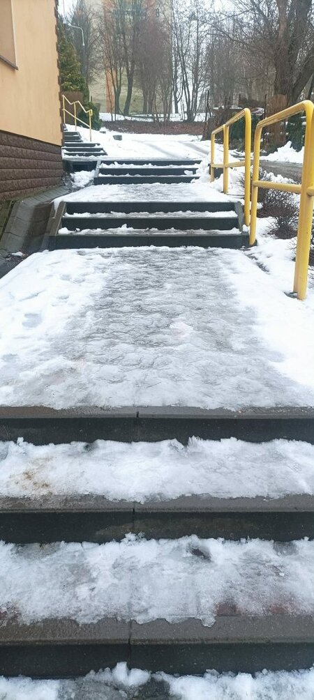 Jak relacjonuje stopnie są bardzo śliskie i łatwo o wypadek. Mieszkanka pyta, do kogo należy obowiązek posypywania schodów i czy w końcu ktoś zajmie się tym problemem?
