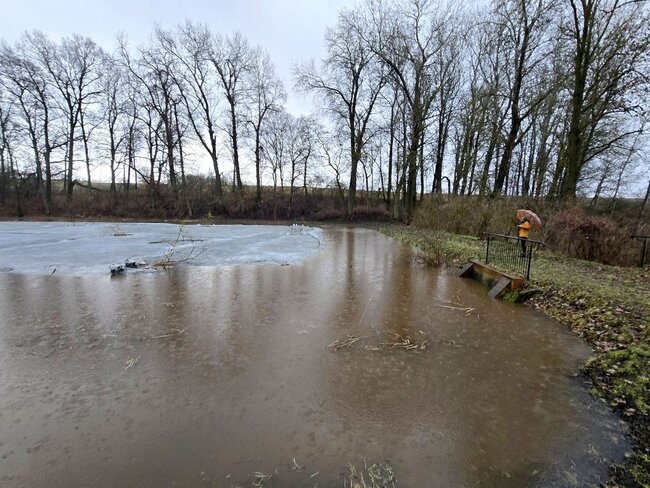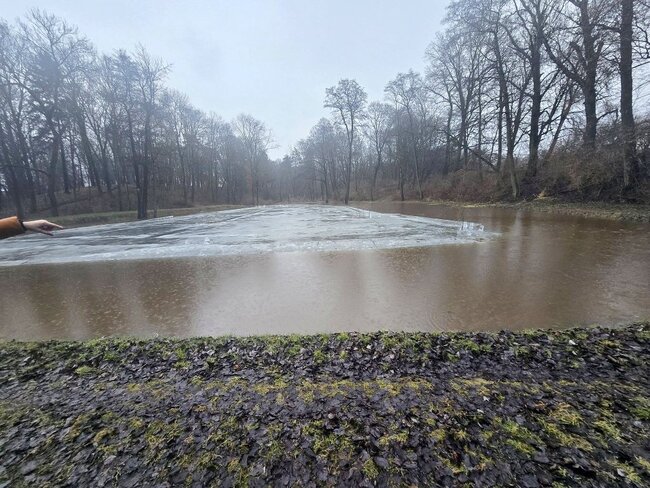Poziom wody na stawie w# Smogulcu osiągnął nienotowany dotąd poziom. To efekt gwałtownych roztopów i zalegającej pokrywy lodowej.