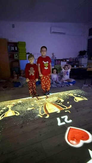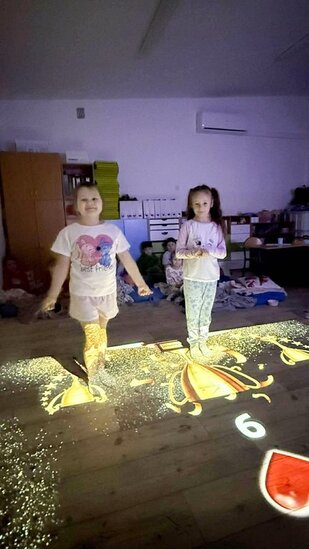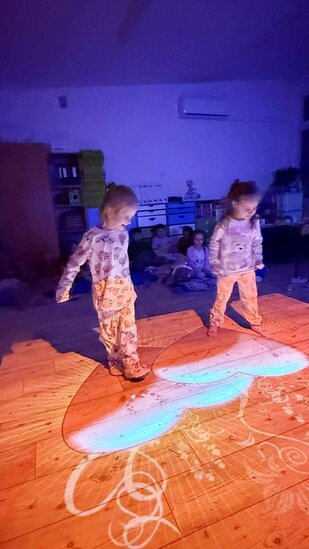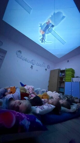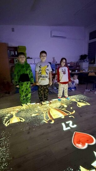 Na uczestników czekało wiele atrakcji. Odbyło się nocne kino, mini dyskoteka, a także zabawy na interaktywnej podłodze, które sprawiły dzieciom mnóstwo radości. Nie zabrakło również czegoś pysznego – wszyscy wspólnie zajadali się smaczną pizzą.