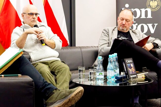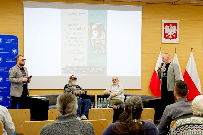 W czwartek odbyło się pierwsze spotkanie# w ramach nowego cyklu „Pogranicza historii”. Gośćmi byli pisarze science fiction Marek Oramus i Marek Żelkowski, a tematem rozmowy była „Fantastyka a PRL”.
