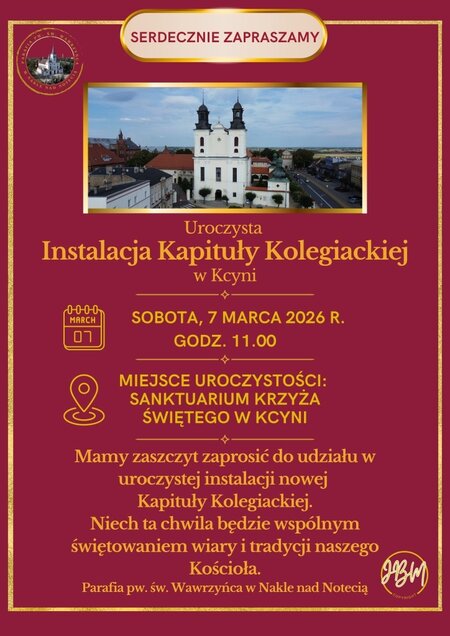 W sobotę 7 marca #o godz. 11:00 w Sanktuarium Krzyża Świętego w Kcyni odbędzie się uroczysta instalacja Kapituły Kolegiackiej. W gronie mianowanych kanoników znajdzie się również proboszcz parafii pw. św. Wawrzyńca w Nakle nad Notecią – ks. dr Michał Adamczyk.