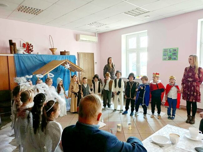 Mali artyści z wielkim zaangażowaniem przedstawili program artystyczny, po czym wspólnie z członkami stowarzyszenia zaśpiewali tradycyjne kolędy. Seniorzy nagrodzili dzieci gromkimi brawami, a na ich twarzach nie brakowało uśmiechów i wzruszenia. To wyjątkowe wydarzenie na długo pozostanie w pamięci zarówno dzieci jak i seniorów, pokazując, jak ważne są takie spotkania budujące więzi i wzajemną życzliwość.
