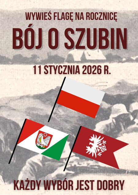 W imieniu organizatorów zachęcamy# do wywieszenia w dniu 11 stycznia 2026 r. flagi, by upamiętnić Bój o Szubin i zdobycie miasta przez Powstańców Wielkopolskich. W tym dniu odbędą się uroczystości 107. rocznicy walk o miasto. Można wywiesić flagę powstańczą, flagę Szubina lub flagę Polski.