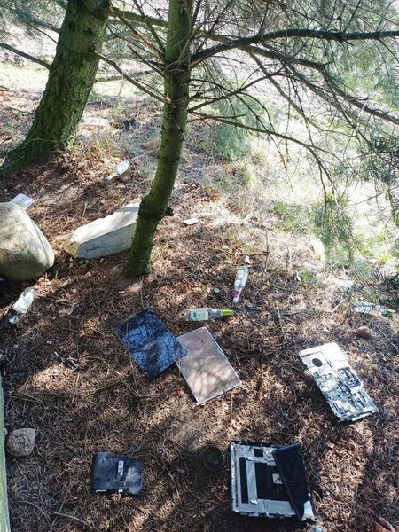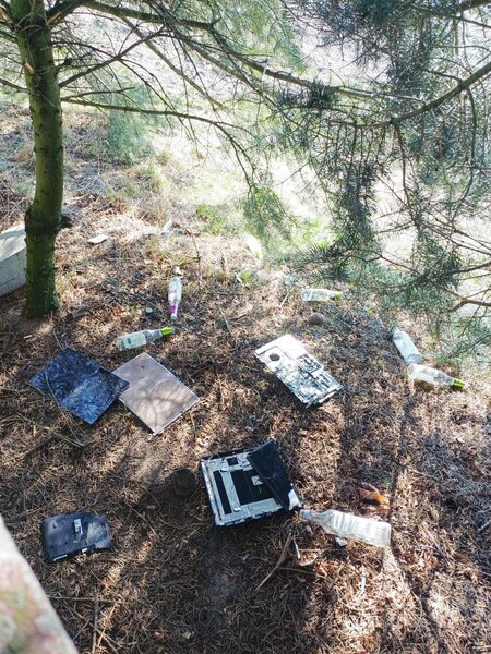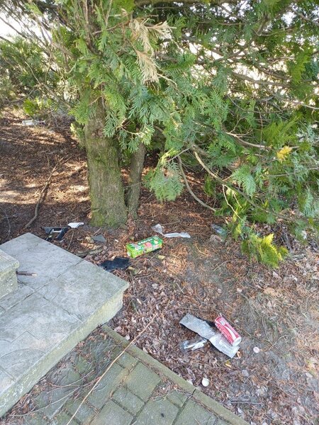 W jego bezpośrednim otoczeniu leżą porozrzucane śmieci - butelki po alkoholu, niedopałki papierosów, opakowania oraz fragmenty rozbitego sprzętu elektronicznego. Okolica wygląda na zaniedbaną. Zamiast ciszy i szacunku widać ślady spotkań, po których pozostał jedynie bałagan.