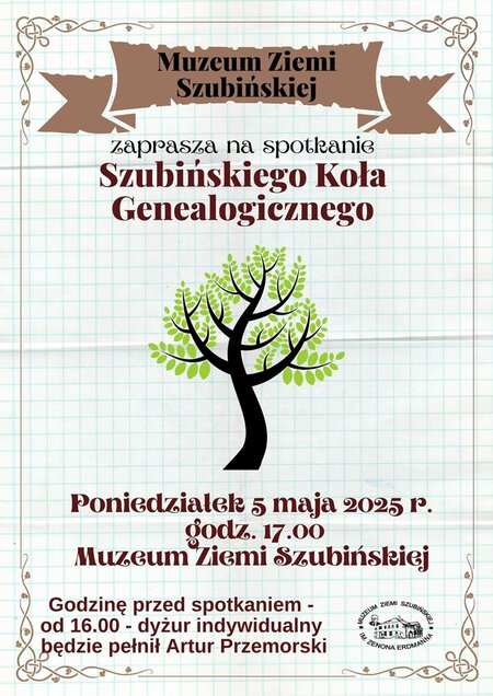 Muzeum Ziemi Szubińskiej zaprasza na # spotkanie Szubińskiego Koła Genealogicznego, które odbędzie się w poniedziałek 5 maja 2025 r. o godz. 17.00 w muzeum.
