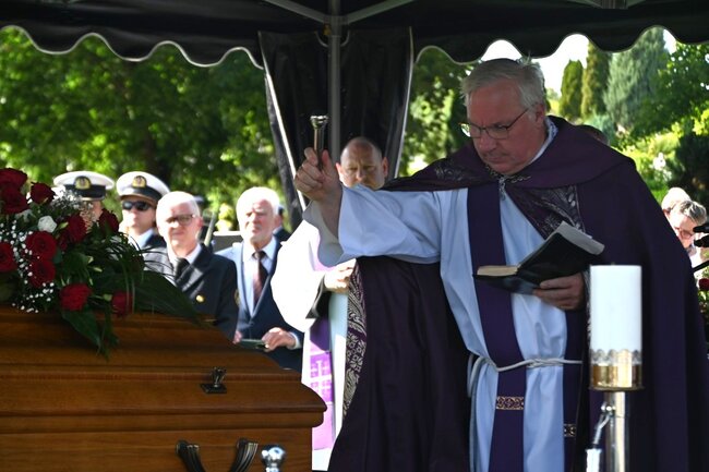 Następnie wszyscy przeszli na cmentarz, by razem odprowadzić zmarłego na miejsce spoczynku. Podczas ceremonii pogrzebowej głos zabrało kilka osób, w tym nowa dyrektor ZSŻŚ w Nakle Agnieszka Kamińska. Odczytane zostało także pismo od wiceministra infrastruktury Arkadiusza Marchewki, gdyż Ministerstwo Infrastruktury jest organem prowadzącym nakielskiej Żeglugi. Zmarłego żegnali przyjaciele z Nakielskiego Towarzystwa Tenisowego „Sokół” i wspominał ksiądz Michał Adamczyk.