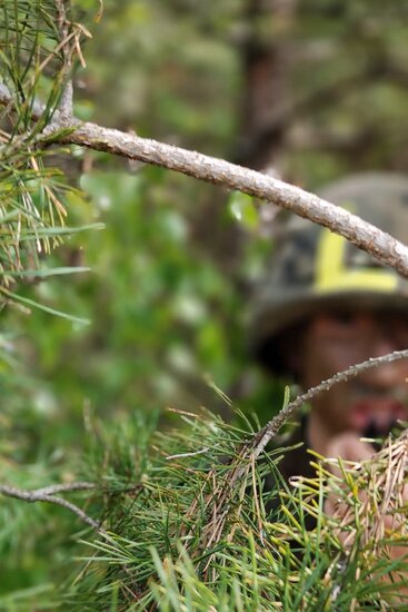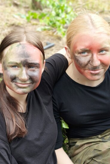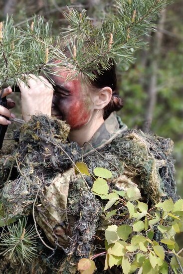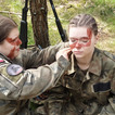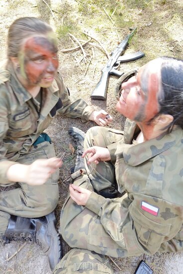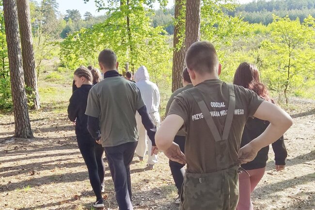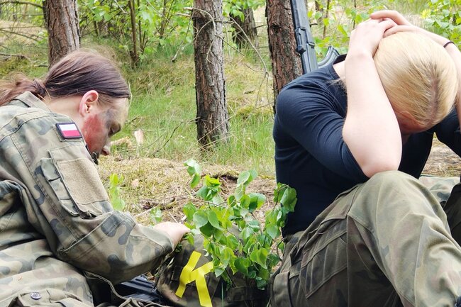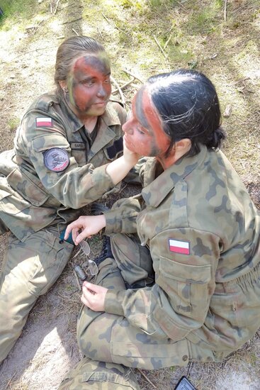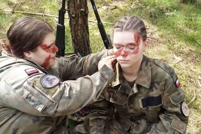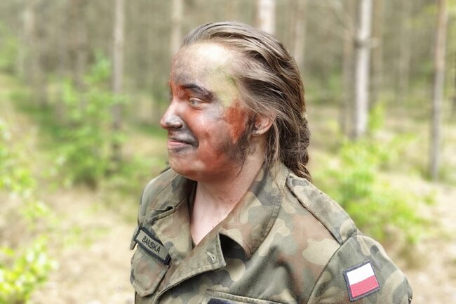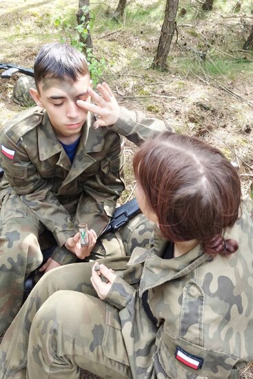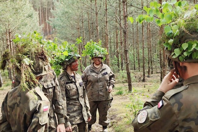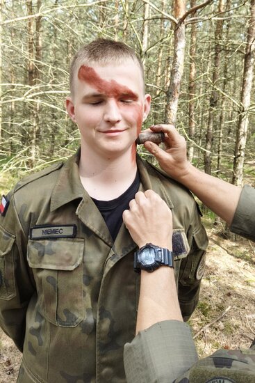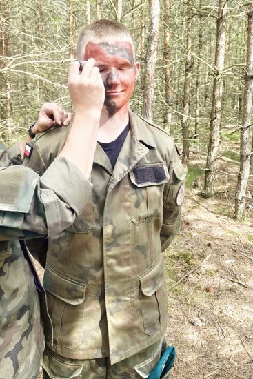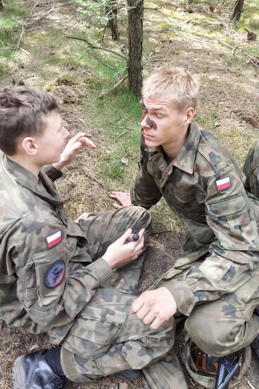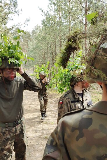 Podporucznik Łukasz Nieradko pokazał techniki maskowania się w różnych warunkach terenowych, tłumacząc, że sztuka kamuflażu sięga początków istnienia wojskowości – to wiedza, która od wieków pomaga żołnierzom ukrywać się przed wrogiem, zarówno podczas przepraw, jak i w czasie obozowania. Po tej części zajęć, kadeci przeszli do bardziej zaawansowanego elementu szkolenia, jakim było skryte przemieszczanie się w terenie. Ich celem było dotarcie do wyznaczonego punktu bez zostania wykrytym przez rozmieszczonych na trasie obserwatorów.