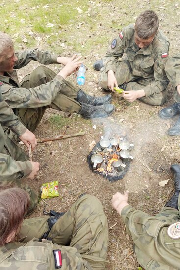 Kadeci zostali przemaszerowani w nowe miejsce, gdzie rozpoczęli praktyczne zajęcia z zakresu: Rozpalania ognia w różnych warunkach, Wybierania odpowiedniego miejsca na odpoczynek, Gotowania wody w kubkach polowych, Przygotowywania prostego posiłku (zupa, kiełbaski) z wykorzystaniem dostępnych środków.