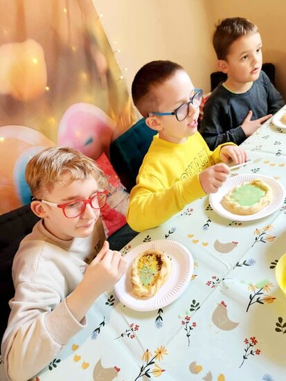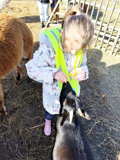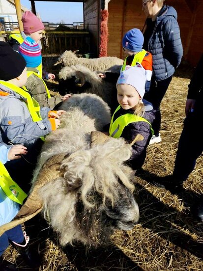 Podczas warsztatów dzieci dekorowały mazurki, ozdabiały drewniane baranki używając wełny z alpak i obserwowały naturalne sposoby na farbowanie jajek. Przedszkolaki miały okazję zbierać jajka z kurnika oraz karmić marchewkami alpaki, kozy, króliki i świnkę. Podziwiały owce, ozdobne kury, pawie i koniki.