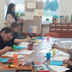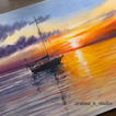 Po krótkim zapoznaniu i ustaleniu naszych celów przystąpiliśmy do pracy, bowiem uczestnicy od razu zapragnęli coś stworzyć. Każdy otrzymał niezbędne do pracy materiały tj. płótno, paletę z farbamj, podkładkę, brudnopis i ściereczkę. Korzystając tylko z trzech kolorów tj. żółci, czerwieni i niebieskiego stworzyliśmy wspólnie, krok po kroku piękny pejzaż przedstawiający łódź żaglową na wodzie.