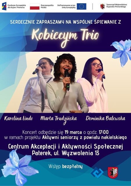 Powiat Nakielski zaprasza na wyjątkowe #spotkanie muzyczne. 19 marca 2026 roku o godzinie 17:00 w Centrum Akceptacji i Aktywności Społecznej w Paterku wystąpi trio wokalne w składzie: Marta Trudzińska, Karolina Lindo oraz Dominika Bielewska. Spotkanie odbywa się w ramach projektu „Aktywni seniorzy z powiatu nakielskiego”.