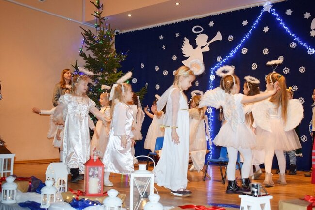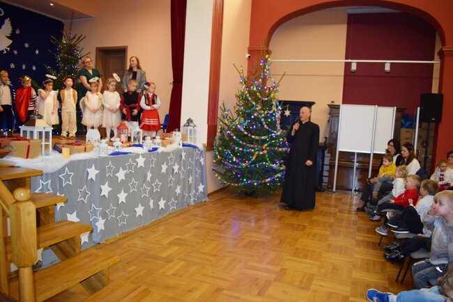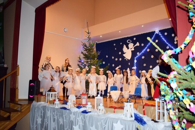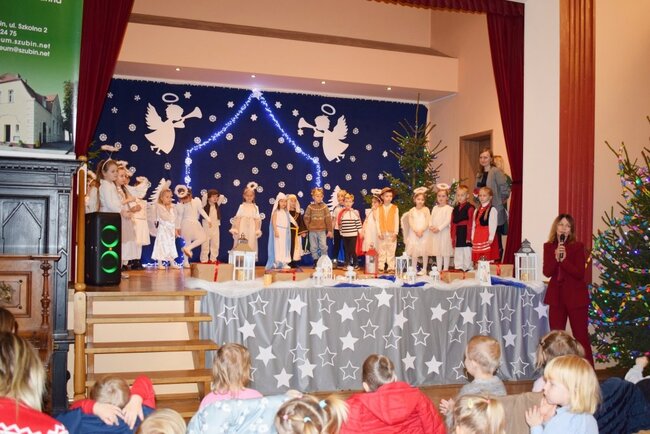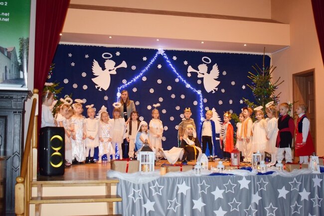 Mali artyści z wielkim zaangażowaniem i odwagą zaprezentowali historię narodzin Pana Jezusa. Przedszkolaki wcieliły się w role Maryi, Józefa, aniołów, pasterzy i trzech króli, zachwycając publiczność nie tylko pięknymi strojami, ale także recytacją, śpiewem kolęd i pastorałek. Występ był dowodem ogromnej pracy dzieci oraz ich wychowawców.