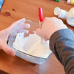 Pierwszym etapem jest przygotowanie masy piankowej. W tym celu do małej miseczki wlewamy około 4 łyżki kleju introligatorskiego i wyciskamy piankę do golenia objętościowo trochę więcej niż piłka tenisowa. Teraz wszystko dokładnie mieszamy. Po pierwszym wymieszaniu masa nam opadnie. Następnie ponownie dodajemy łyżkę kleju i taką samą ilość pianki. Tym razem delikatnie i krótko mieszając, aby została nam piankowa struktura. Poniżej na zdjęciach widać jak to powinno wyglądać.
