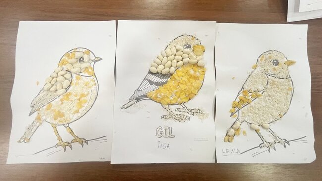 Mieliśmy również czas na zajęcia sensoryczne. Z miseczki pełnej sypkich produktów powoli i z dokładnością trzeba było wykleić ptaszka. Oczywiście wszystkie prace były piękne.