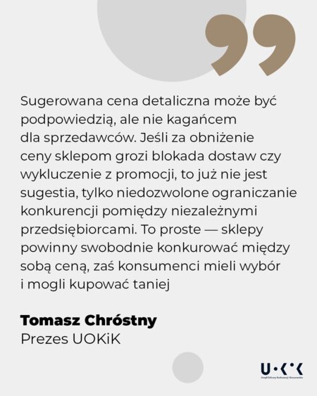 – Sugerowana cena detaliczna może być podpowiedzią, ale nie kagańcem dla sprzedawców. Jeśli za obniżenie ceny sklepom grozi blokada dostaw czy wykluczenie z promocji, to już nie jest sugestia, tylko niedozwolone ograniczanie konkurencji pomiędzy niezależnymi przedsiębiorcami. To proste – sklepy powinny swobodnie konkurować między sobą ceną, zaś konsumenci mieli wybór i mogli kupować taniej – mówi Prezes UOKiK Tomasz Chróstny.