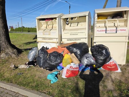 Trzeba robić zdjecia z numerami rejestracyjnymi osob ktore podrzucają smieci i zgłaszać na policję za zaśmiecanie. Mandat murowany. A w urzędzie miasta żądać usunięcia tych gównianych kontenerów z których nikt nie odbiera ciuchów.