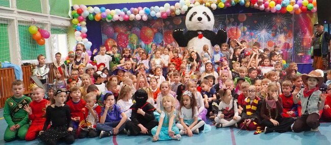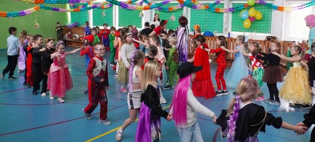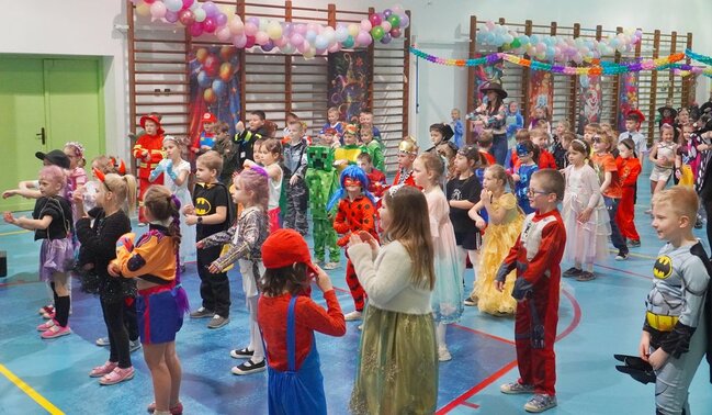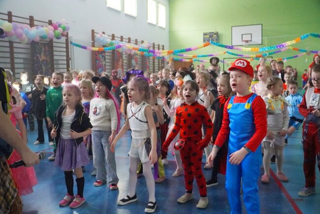 Od samego początku salę wypełniała radosna atmosfera - pięknie przystrojona przestrzeń mieniła się kolorami balonów i dekoracji, tworząc prawdziwie karnawałowy klimat. Wśród uczestników można było podziwiać bajkowe, kreatywne i bardzo starannie przygotowane stroje, które wzbudzały zachwyt zarówno wśród dzieci, jak i nauczycieli. Podczas balu nie zabrakło śmiechu, wspólnych tańców i doskonałej zabawy. Całość prowadzili pan Marcin oraz pan Tymek, którzy z ogromnym entuzjazmem zachęcali uczniów do aktywnego udziału w zabawach tanecznych. Dzieci chętnie uczyły się prostych układów tanecznych, brały udział w animacjach i bawiły przy znanych, wesołych piosenkach. Bal był doskonałą okazją do integracji, rozwijania kreatywności oraz wspólnego spędzania czasu w radosnej atmosferze. Uśmiechy na twarzach dzieci były najlepszym dowodem na to, że karnawałowa zabawa była niezwykle udana.