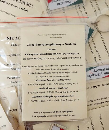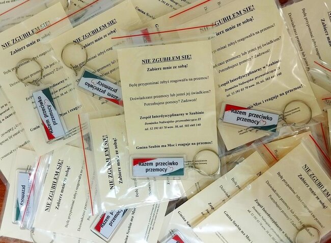 W ramach Kampanii na terenie Gminy Szubin w miejscach publicznych rozdysponowane zostaną breloczki z danymi Zespołu oraz informacje na temat bezpłatnych porad prawnych i psychologicznych dla świadków i osób doświadczających przemocy.