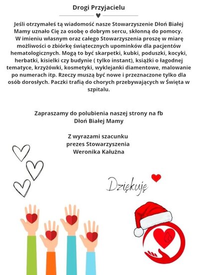 Zbieraliśmy rzeczy, które mają wnieść w szpitalną codzienność choć odrobinę ciepła: miękkie kocyki i poduszki, kolorowe skarpetki, kubki, herbatki, słodkie budynie i kisiele instant, krzyżówki, książki o spokojnej tematyce oraz różne kosmetyki. Udało się zebrać naprawdę piękne upominki, z których wolontariusze Stowarzyszenia Dłoń Białej Mamy przygotują świąteczne paczki, a te trafią do pacjentów w czasie świąt. W tym roku do akcji dołączyła również wspaniała młodzież z ZSP w Lubaszczu. Oni także zorganizowali zbiórkę u siebie i pokazali, że dobro naprawdę potrafi się mnożyć, kiedy jest dzielone.