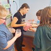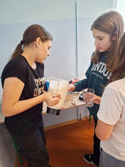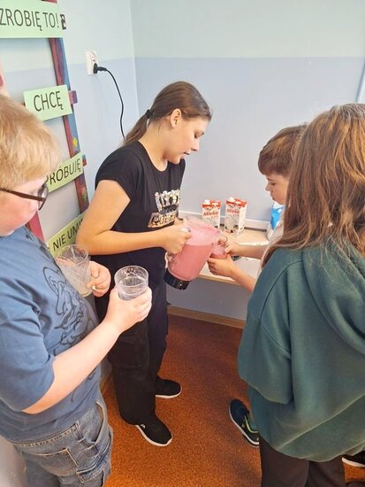 Nie zabrakło również czegoś dla miłośników owocowych smaków. Młodzież z dużym entuzjazmem przygotowywała kremowe koktajle mleczno-owocowe. Do blendera trafiły dojrzałe banany, mrożone maliny i truskawki, które w połączeniu z mlekiem stworzyły orzeźwiające, gęste napoje, pełne naturalnej słodyczy i błonnika. Warto dodać, że na stołach zagościła jeszcze ciepła chałka domowego wypieku, z dużą ilością kruszonki.