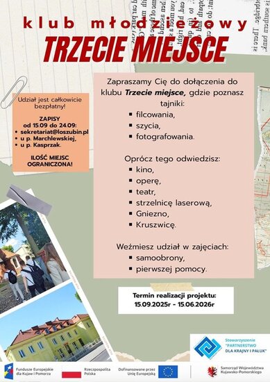 Zajęcia i wyjazdy w ramach działania Klubu młodzieżowego “Trzecie miejsce” w I Liceum Ogólnokształcącym w Szubinie są całkowicie bezpłatne, dofinansowane w ramach inicjatywy „Młodzi w Dolinie Noteci”, współfinansowanej ze środków programu regionalnego Fundusze Europejskie dla Kujaw i Pomorza 2021–2027.