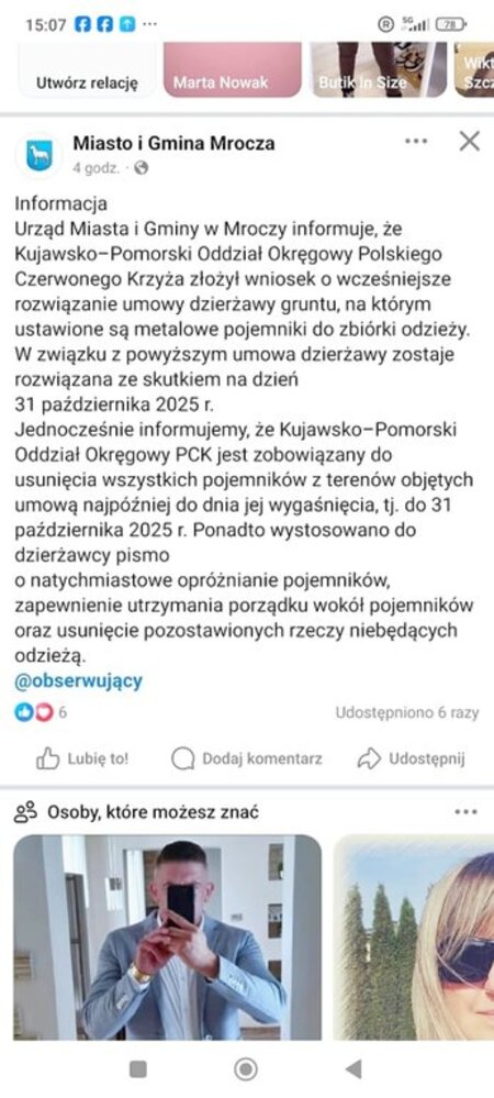 Chciałbym ponownie poruszyć temat zaśmiecania terenu wokół kontenerów na odzież przy ulicy Czereśniowej w Mroczy. Po ostatnim artykule na Państwa portalu teren został uprzątnięty. Na FB pojawiło się pismo urzędu miasta z informacją o rozwiązaniu umowy z PCK oraz usunięciu kontenerów do końca października. Niestety kontenery jak stały tak stoją a wokół nich kolejne wysypisko śmieci. Ze strony UM jak na razie brak reakcji.