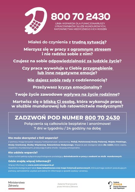 Pod numerem 800 70 2430 funkcjonuje całodobowa i bezpłatna Linia Wsparcia dla Funkcjonariuszy i Pracowników Służb Mundurowych, Ratownictwa Medycznego i ich Rodzin.