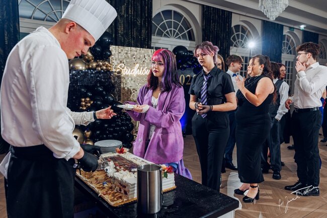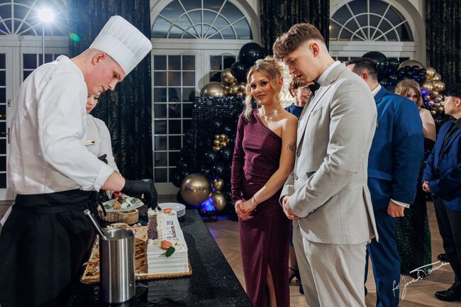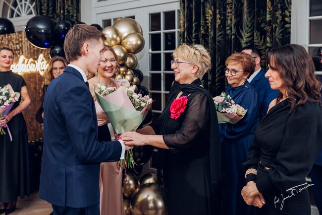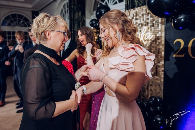 Zabawa trwała do godziny 3:00, wszyscy uczestnicy balu bawili się wyśmienicie. Dziękujemy obsłudze oraz managerom Pałacu w Sucharach za przepięknie przygotowaną salę oraz za pyszne jedzenie. Pani Romce Wegner i Kwiaciarni Roma za cudowne kompozycje kwiatowe i bukiety dla grona pedagogicznego. Państwu Tydda dziękujemy za bardzo smaczny tort. Specjalne podziękowania kierujemy do Pani Aleksandry Kwasigroch, dyrektora Szkoły Podstawowej nr 2 w Nakle nad Notecią za udostępnienie sali gimnastycznej do prób poloneza pod okiem pani A. Dolacinskiej.