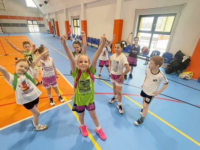 Codziennie nasi mali podopieczni trenują gry i zabawy pokrewne koszykówce, a najstarsza grupa ma już za sobą 5 pełnych treningów koszykarskich.