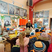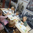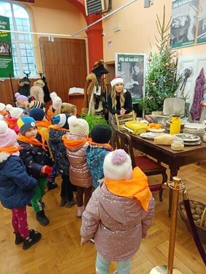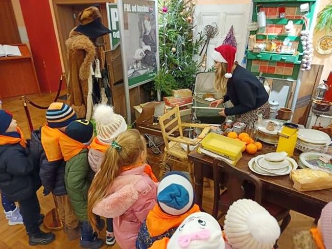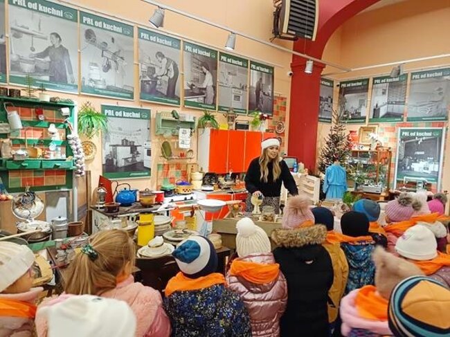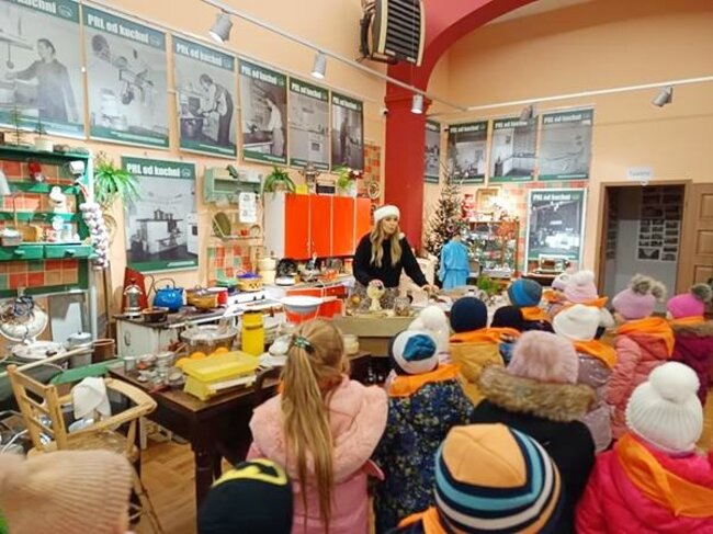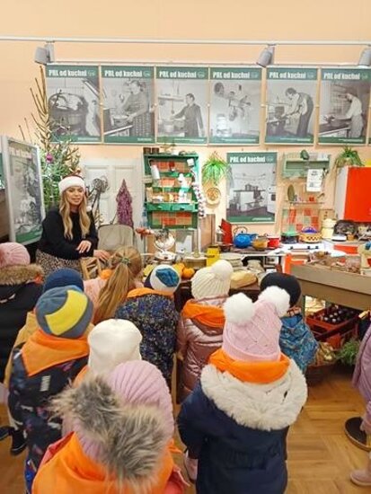 Po twórczej części zajęć na dzieci czekała kolejna atrakcja – zwiedzanie wystawy „Kuchnia PRL-u”. Przedszkolaki mogły zobaczyć charakterystyczne dla tamtych czasów wyposażenie kuchni, takie jak naczynia, sprzęty, meble. Dzięki temu maluchy poznały realia życia codziennego w minionej epoce oraz dowiedziały się, jak wyglądało przygotowywanie posiłków w czasach ich dziadków. Wystawa wzbudziła wiele ciekawości i pytań, a niektóre eksponaty wywołały wśród dzieci prawdziwy zachwyt.