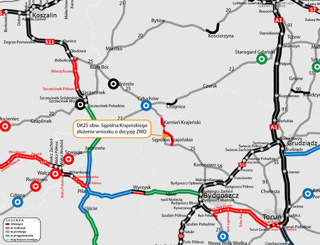 W grudniu ubiegłego roku, po 10 miesiącach od podpisania umowy, złożyliśmy wniosek o decyzję ZRID dla obwodnicy Kamienia Krajeńskiego w ciągu DK25, która jest realizowana przez tego samego wykonawcę. Oznacza to, że w przypadku obu obwodnic wykonawca terminowo opracował niezbędną dokumentację i złożył wniosek o pozwolenie na budowę. Wojewoda Kujawsko-Pomorski wszczął już postępowanie administracyjne dla obwodnicy Kamienia Krajeńskiego.