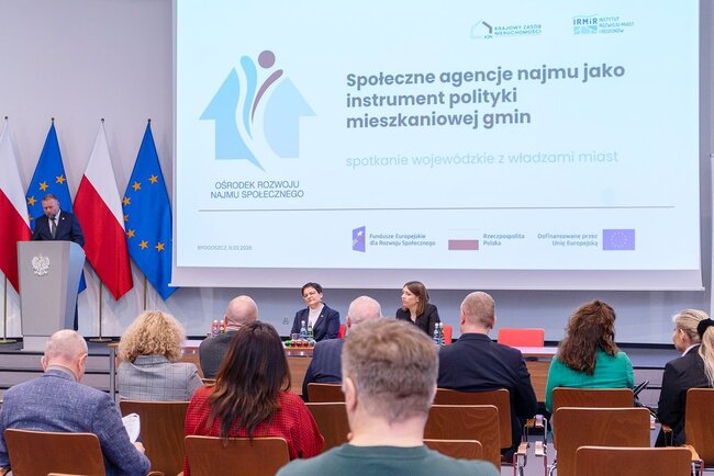 Podczas spotkania eksperci Krajowy Zasób Nieruchomości (KZN) oraz Szkolenia - Instytut Rozwoju Miast i Regionów (IRMiR) przedstawili szczegóły projektu „Ośrodek Rozwoju Najmu Społecznego”, finansowanego z Funduszy Europejskich dla Rozwoju Społecznego (FERS):