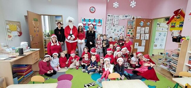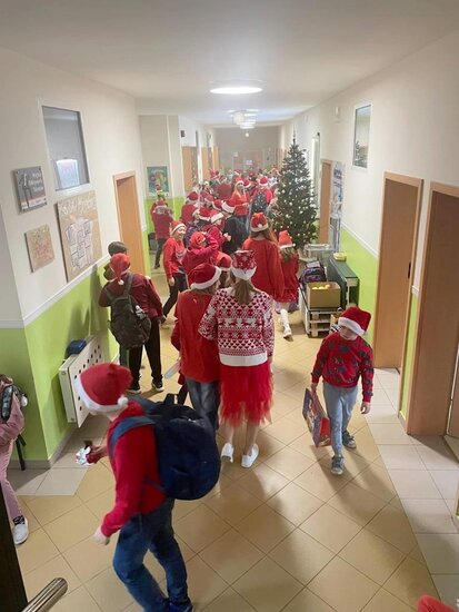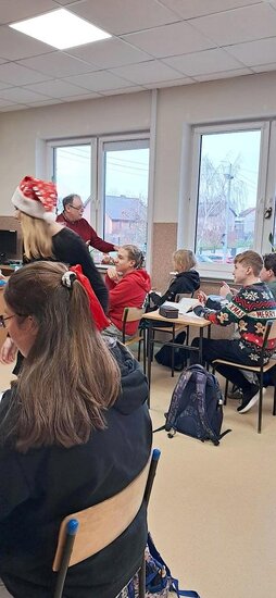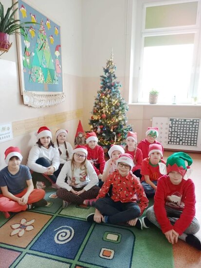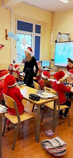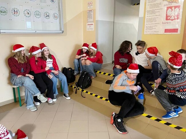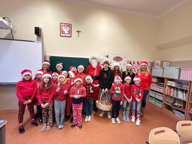 Podczas przerw rozbrzmiewały świąteczne piosenki – nad obsługą muzyki czuwał Samorząd Uczniowski. W tych magicznych okolicznościach odwiedził nas też ten najważniejszy Mikołaj ze swoimi pomocnikami. Jak co roku, obdarował wszystkie przedszkolaki i wszystkich uczniów, ale również grono pedagogiczne oraz pracowników szkoły czekoladowymi przysmakami, za które bardzo dziękujemy Radzie Rodziców na czele z p.Sylwią Rybicką- Miziułą.