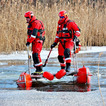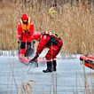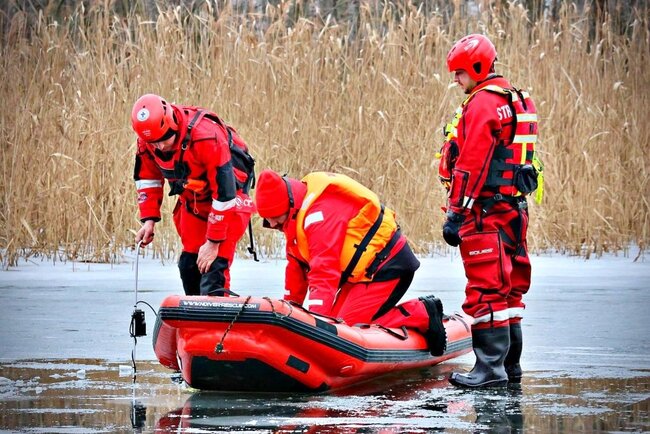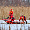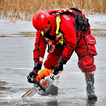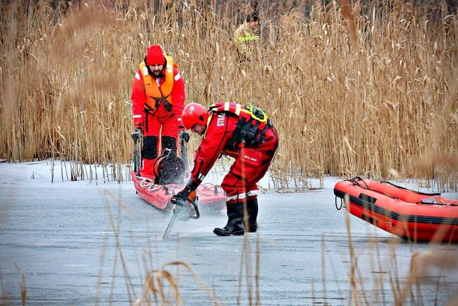 Praca na lodzie: Strażacy co kilka metrów wycinają otwory w pokrywie lodowej przy użyciu pił spalinowych. Dzięki temu nasi ratownicy mogą wprowadzać sonary i dokładnie przeszukiwać dno rzeki.