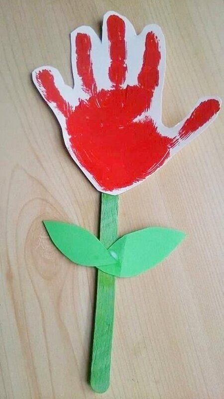 Każdy kwiat ma płatki w kształcie dziecięcych rąk odbitych czerwoną farbą na białym papierze. Odciski zostały wycięte i ułożone tak, aby przypominały kwiatowe główki.