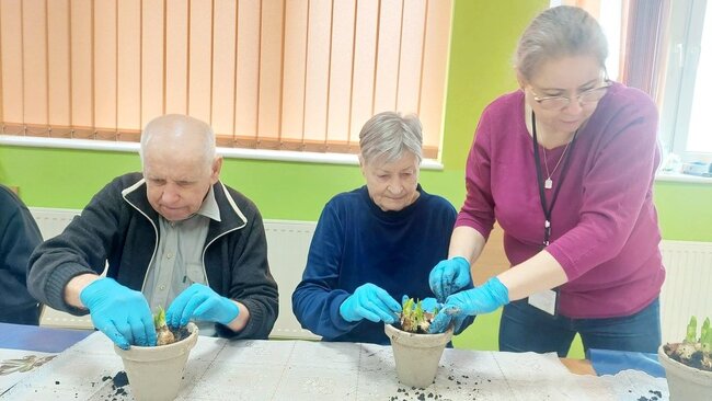 Zajęcia zostały przygotowane i poprowadzone przez panią Dorotę z kwiaciarni Decor z Rynarzewa, która zadbała o każdy detal i wprowadziła nas w prawdziwie świąteczny nastrój. Pod czujnym okiem prowadzących nasi mieszkańcy tworzyli piękne, kolorowe kompozycje pełne wiosennych kwiatów i wielkanocnych akcentów.