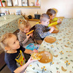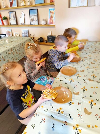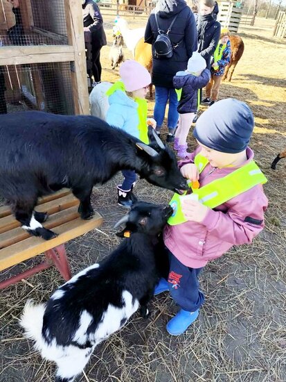 Podczas warsztatów dzieci dekorowały mazurki, ozdabiały drewniane baranki używając wełny z alpak i obserwowały naturalne sposoby na farbowanie jajek. Przedszkolaki miały okazję zbierać jajka z kurnika oraz karmić marchewkami alpaki, kozy, króliki i świnkę. Podziwiały owce, ozdobne kury, pawie i koniki.