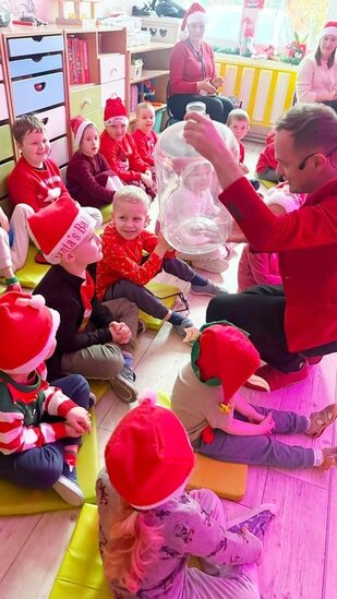 Z okazji Mikołajek przedszkolaki z# grup Żabki i Misie ze Szkoły Podstawowej im. Jana Pawła II w Kowalewie odwiedził niezwykły gość – iluzjonista!