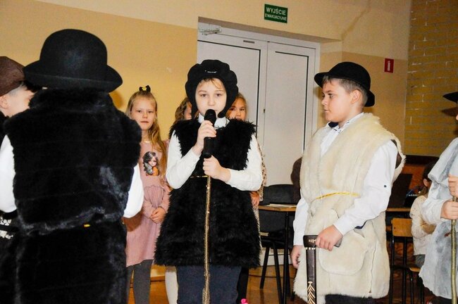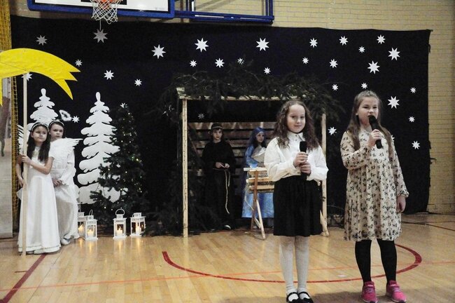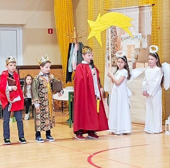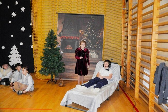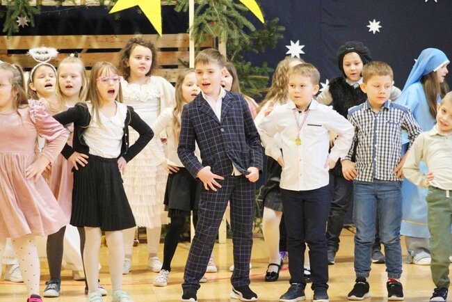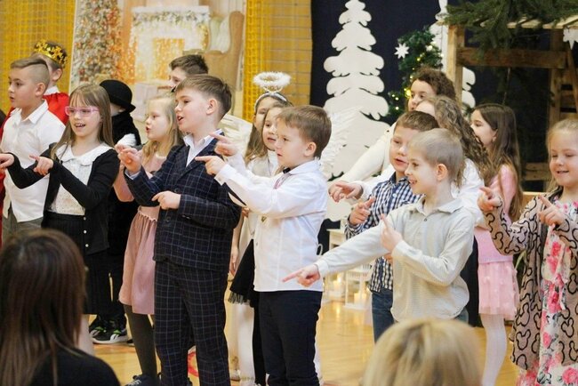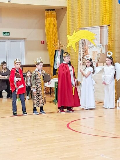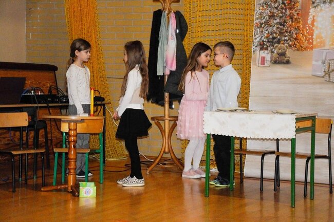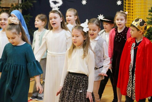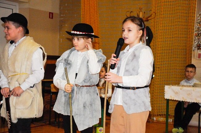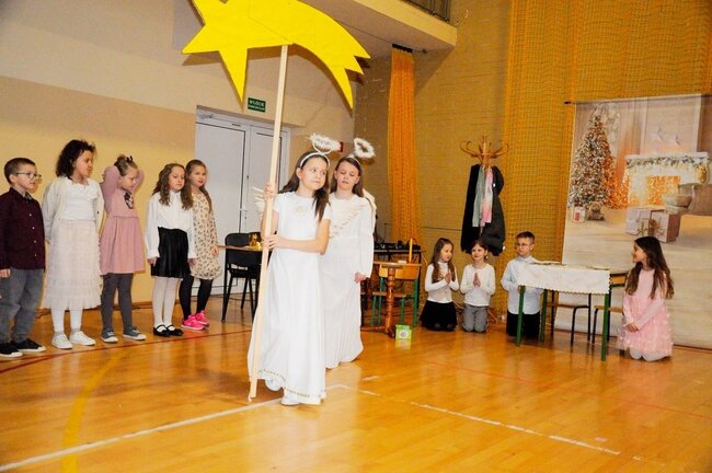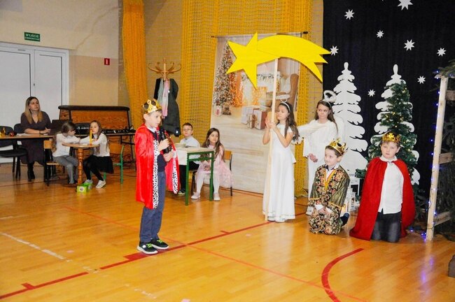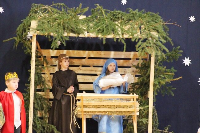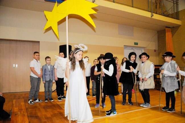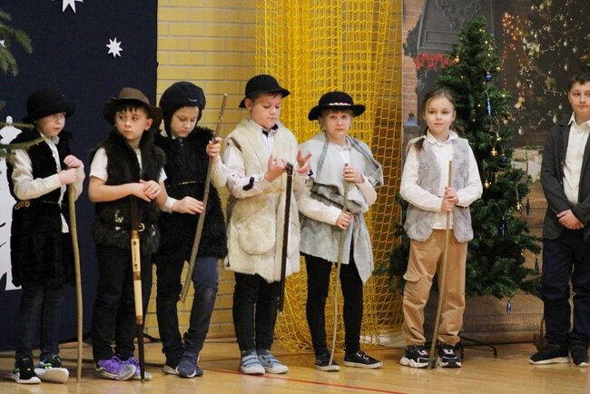 Następnie uczniowie klasy drugiej i trzeciej zaprezentowali jasełka, które w niezwykle ciekawy sposób łączyły świat współczesny ze scenami rozgrywającymi się w stajence przy małym Jezusie. Przedstawienie zachwyciło widzów zarówno treścią, jak i zaangażowaniem młodych aktorów.