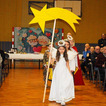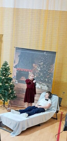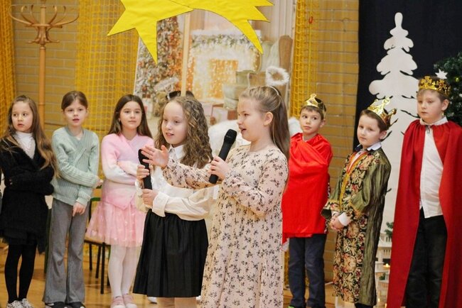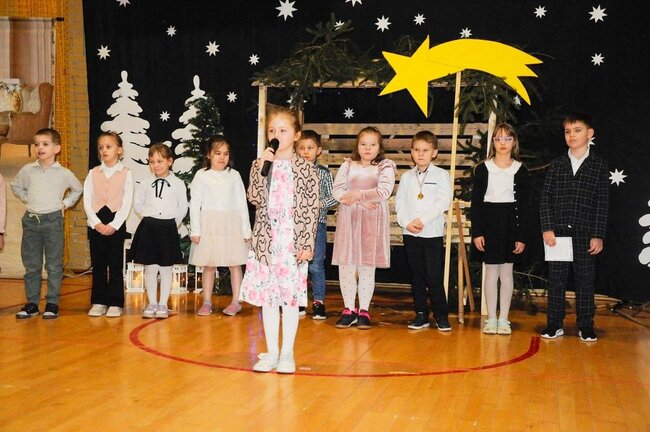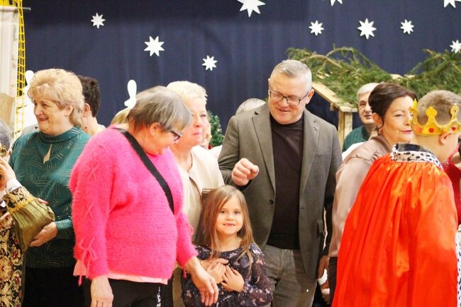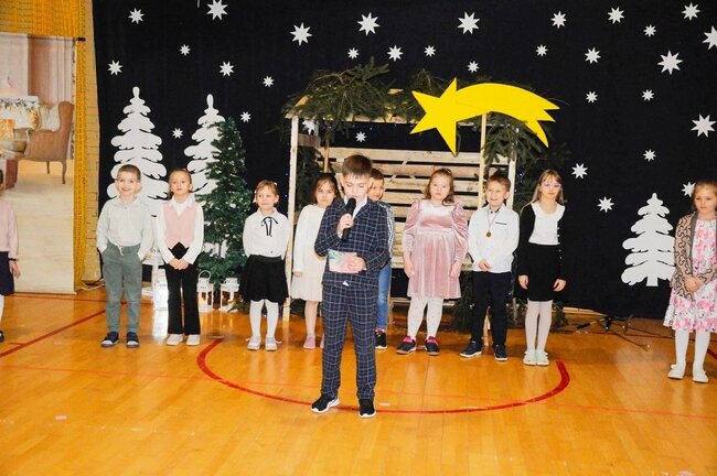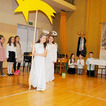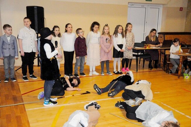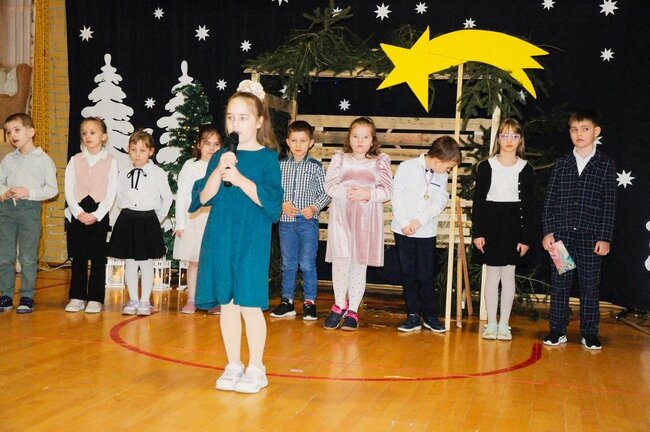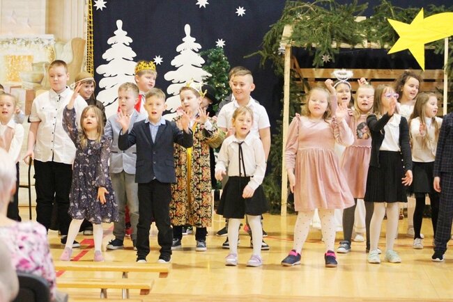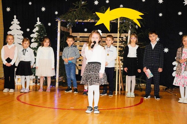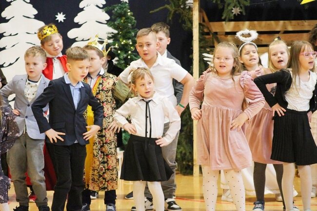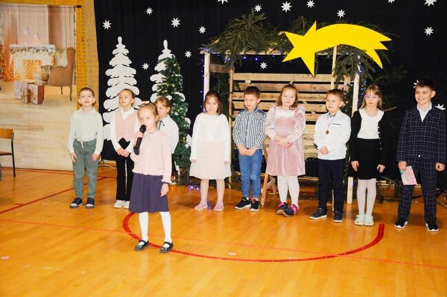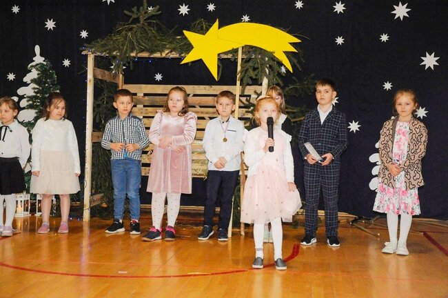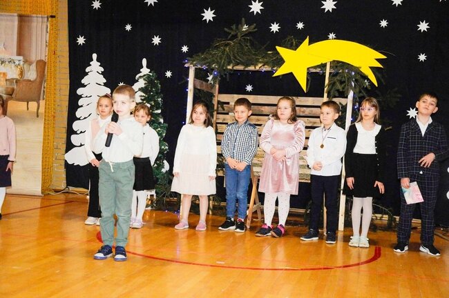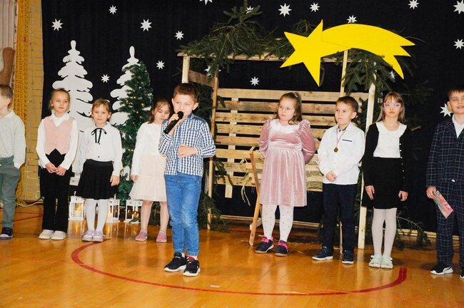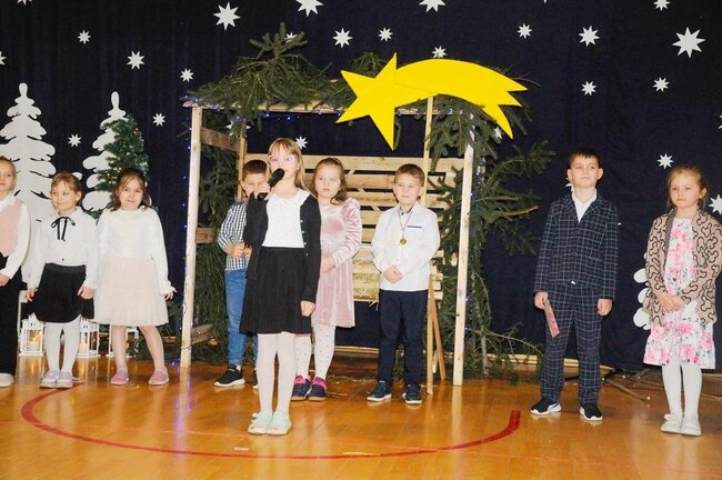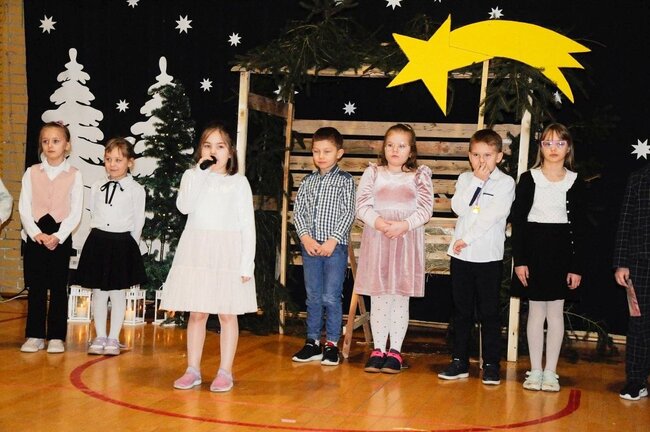 Następnie uczniowie klasy drugiej i trzeciej zaprezentowali jasełka, które w niezwykle ciekawy sposób łączyły świat współczesny ze scenami rozgrywającymi się w stajence przy małym Jezusie. Przedstawienie zachwyciło widzów zarówno treścią, jak i zaangażowaniem młodych aktorów.