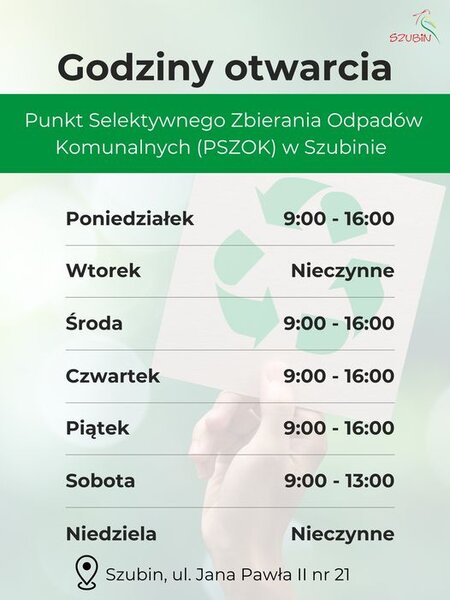 Informujemy, że od dnia 1 sierpnia 2024 r. Punkt Selektywnego Zbierania Odpadów# Komunalnych – PSZOK zlokalizowany w Szubinie przy ul. Jana Pawła II nr 21, będzie czynny w poniedziałki, środy, czwartki, piątki w godz. od 9.00 do 16.00 oraz w soboty od godz. 9.00 do 13.00.